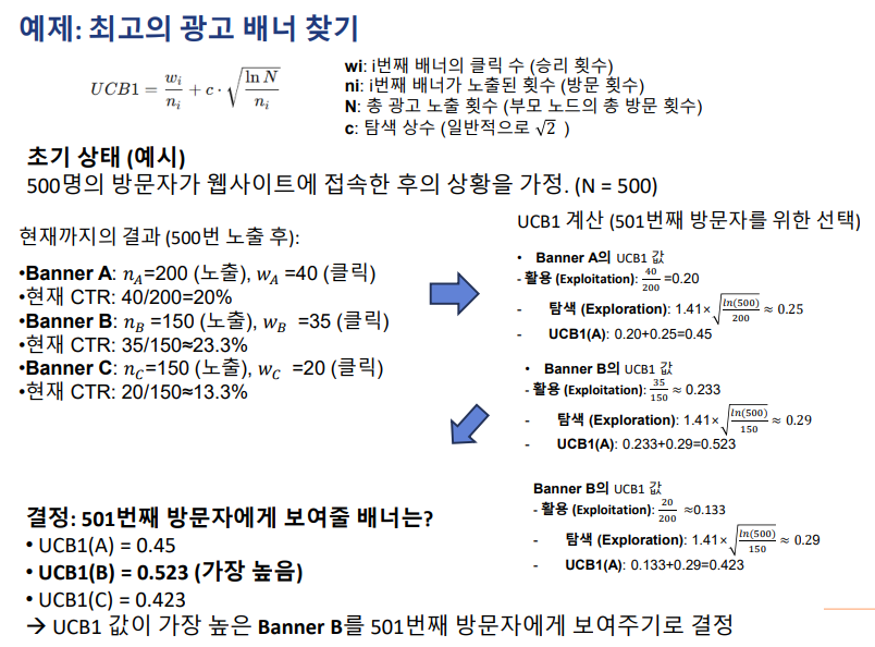 – 핵심적으로 사용되는 함수가 바로 UCB1(Upper Confidence Bound 1)