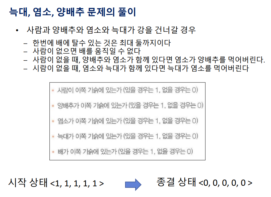 • 일정한 규칙과 목표 상태가 주어진 경우 인공지능을 이용하여 해결하는 방법의 예